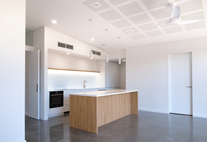High ceilings and polished concrete floors throughout necessitated the use of acoustic ceilings to help quieten the noise of a busy family with three boys.