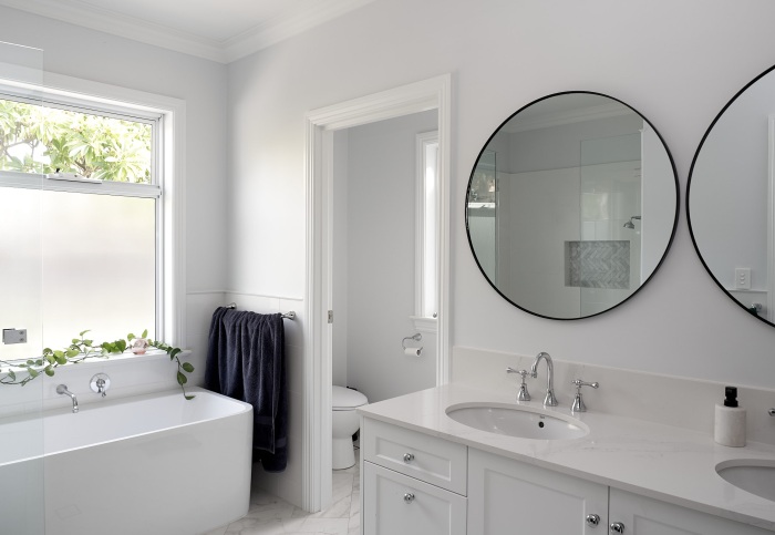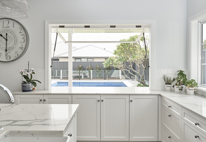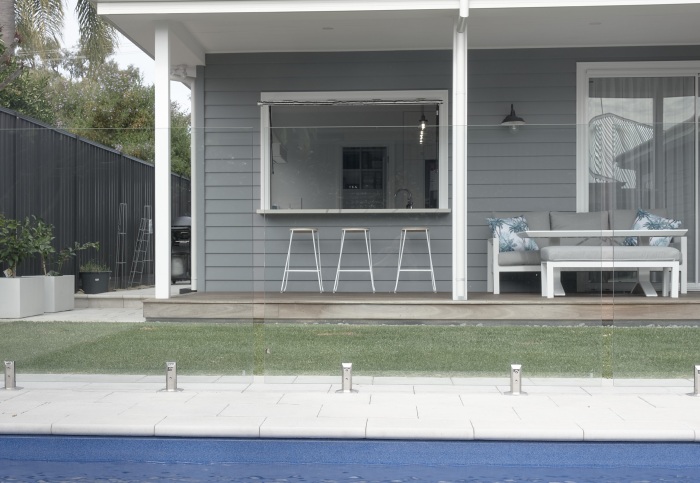 The garage and pool house are separate, designed to keep the garage away from the main street frontage. The use of both buildings enables some privacy and quietness to the pool and entertaining area in a busy suburb.
